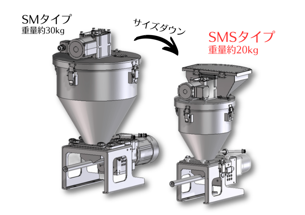 SMスクリューフィーダーでは最小容量が10Lまででしたが、SMスクリューフィーダーの小型タイプ「SMSスクリューフィーダー」では、ホッパー容量5Lを標準に、全体的なサイズダウン・計量化を実現しました