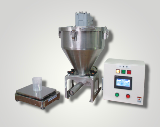 秤の上に容器を置き、容器へ供給します。その際に秤の増量していく重さを量り計量します