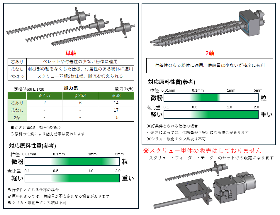 φ38スクリュー単軸タイプではさらに、「芯あり」「芯なし」「2条」の3種類のスクリューを基本パーツとしてそろえています