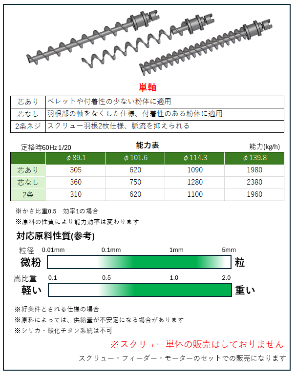 単軸タイプ「芯あり」「芯なし」「2条」の3種類のスクリューを基本パーツとしてそろえています